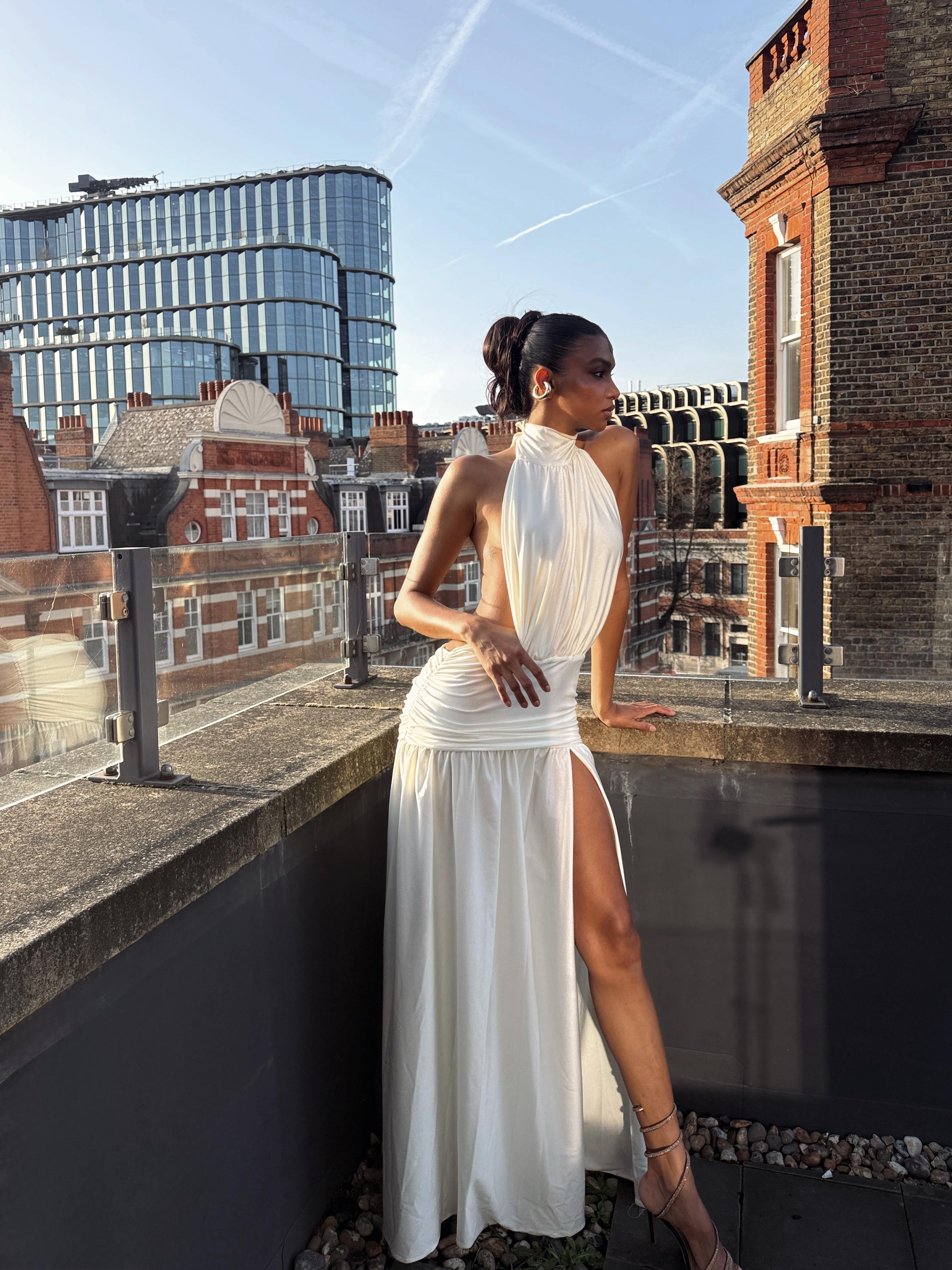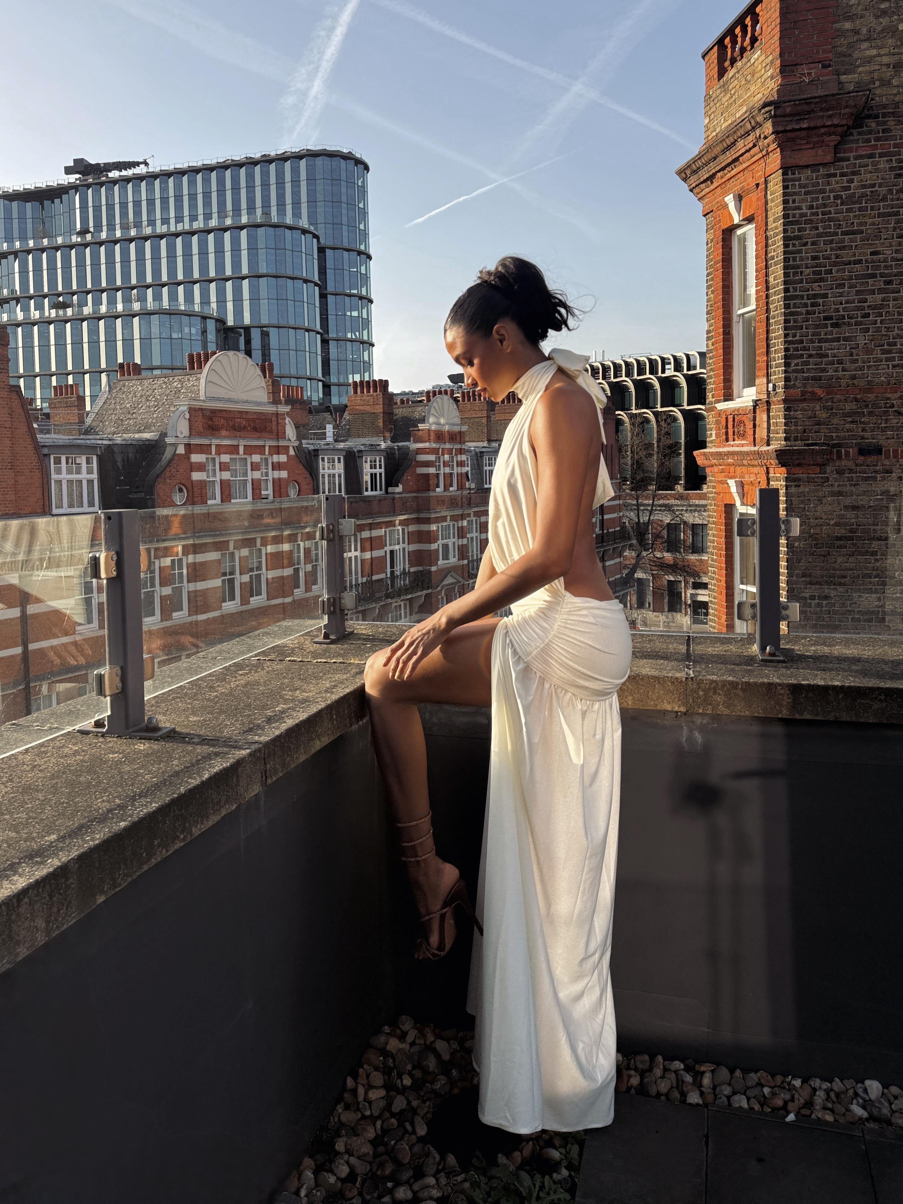 Rooftop. Atardecer dorado. Un vestido blanco que se mueve con el viento y captura cada mirada. Diseñado para mujeres que no piden atención... la atraen.
