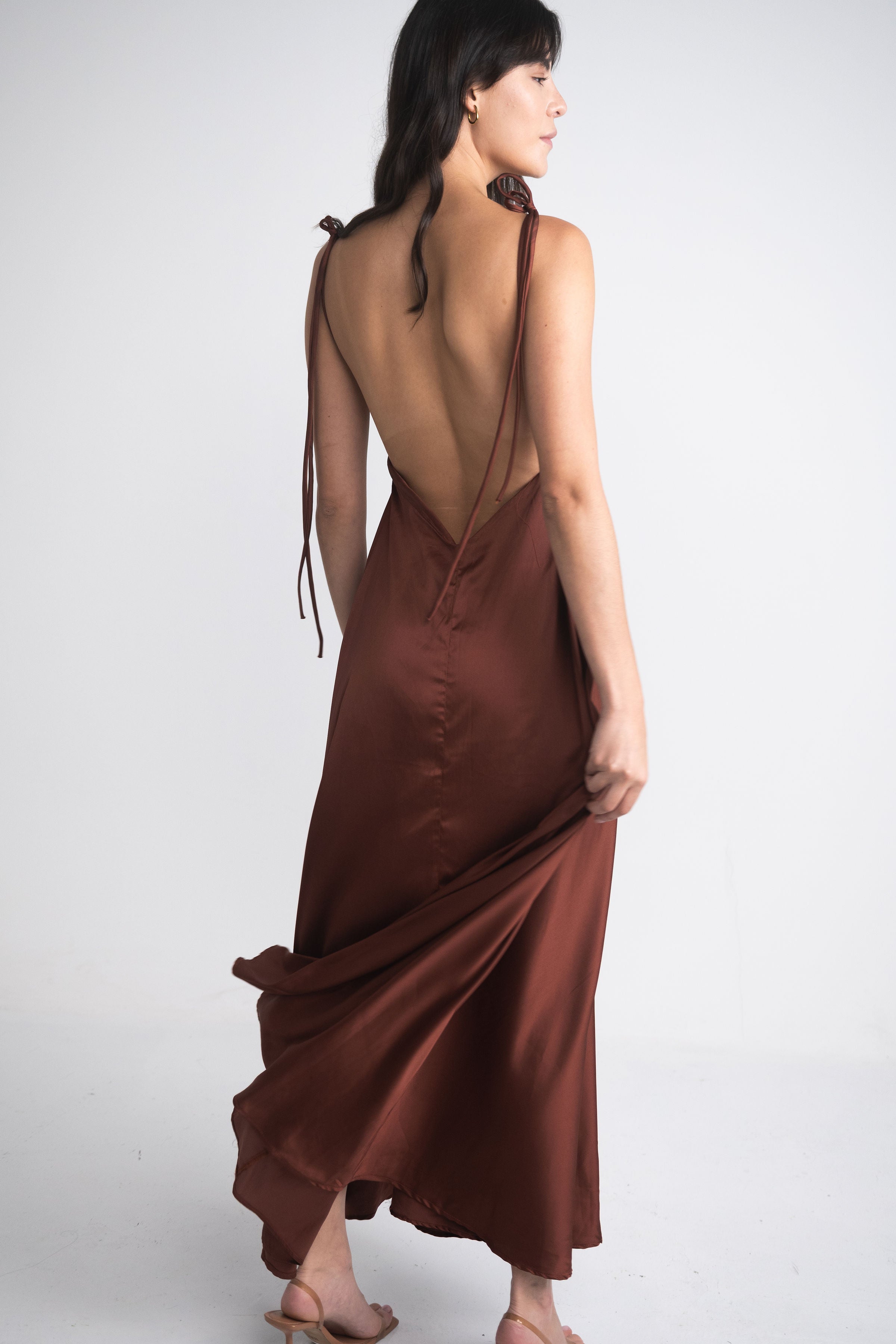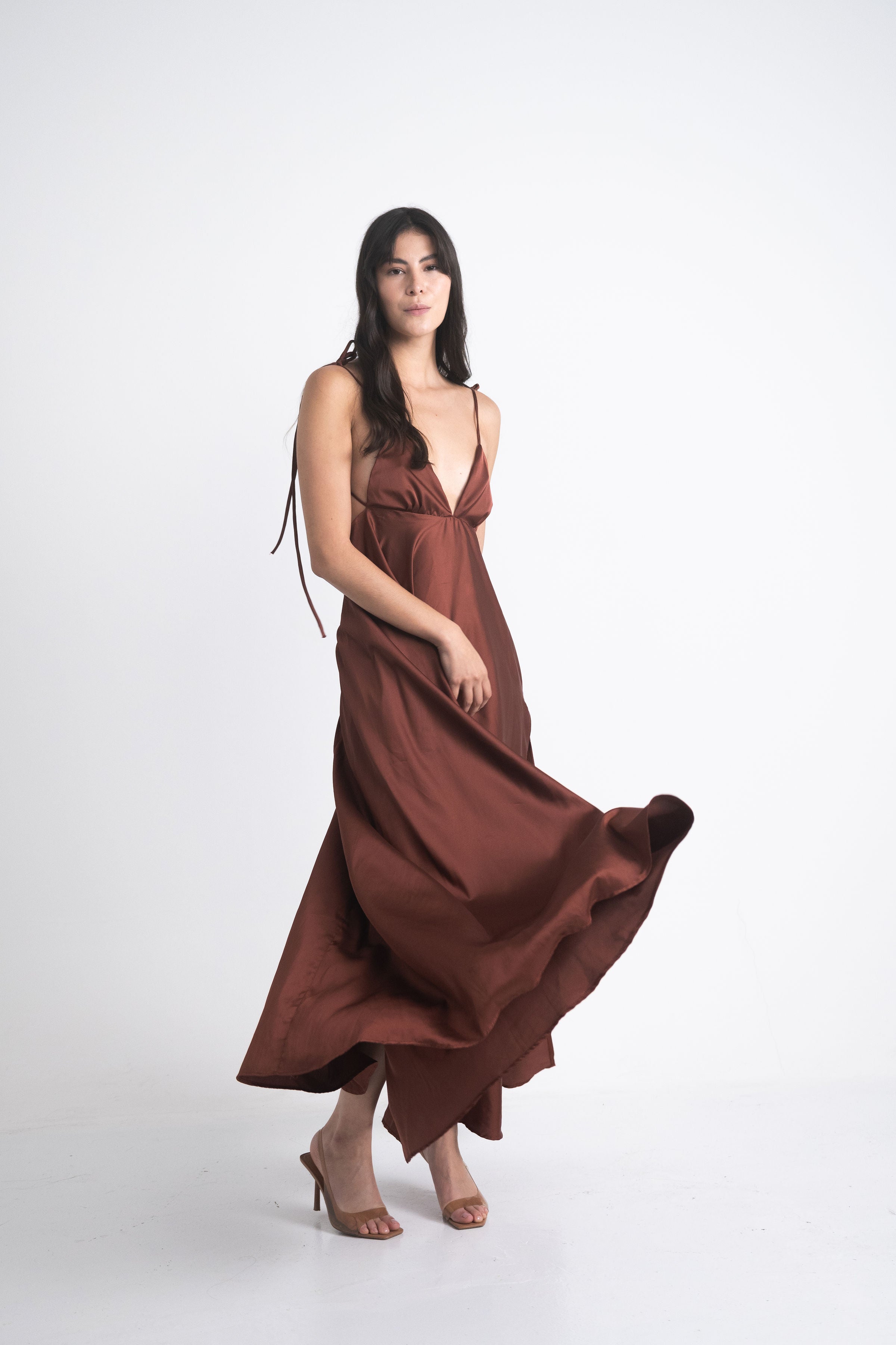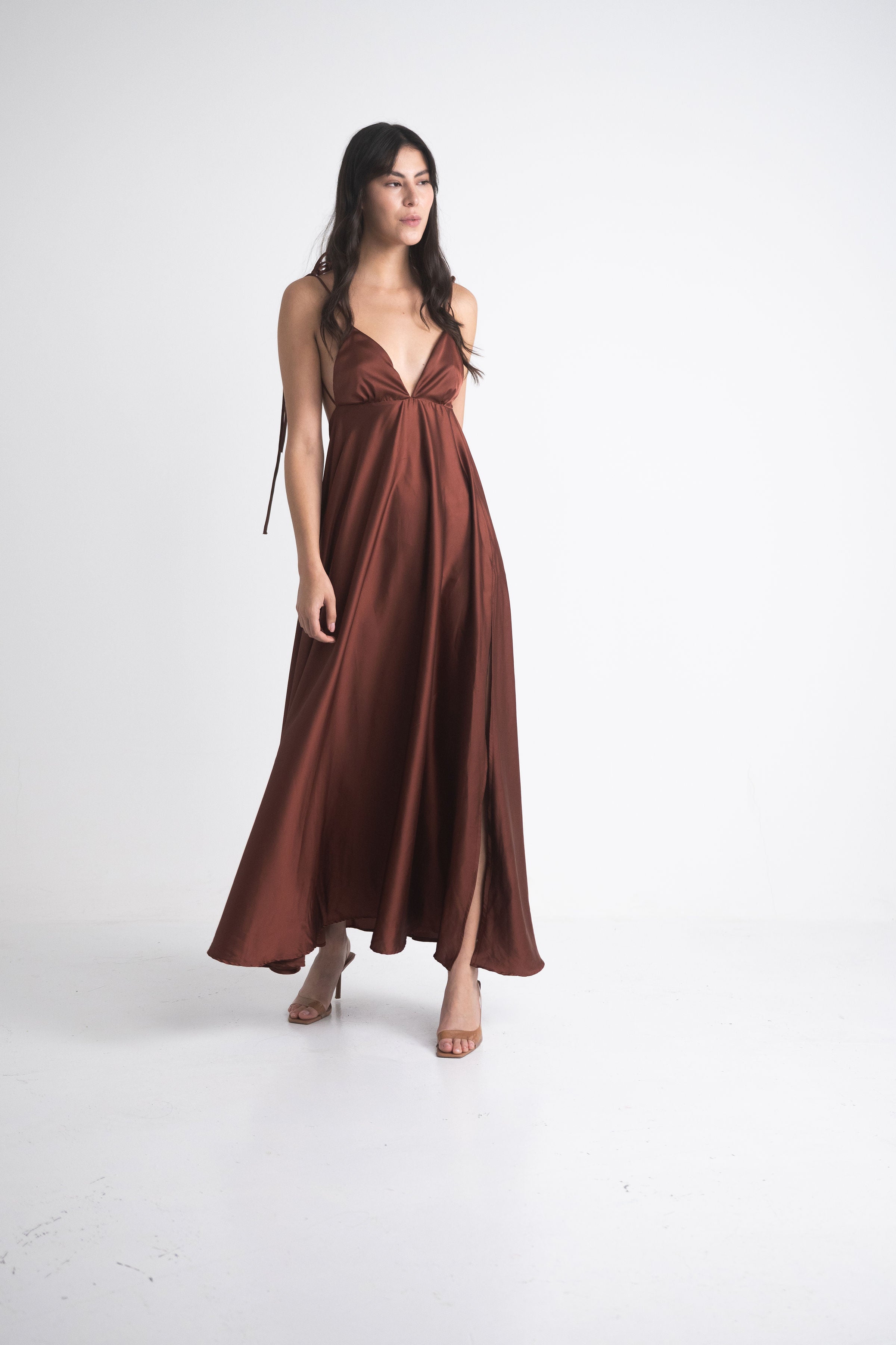 Diseñado en una seda satín suave y luminosa, este vestido se adapta a ti como una segunda piel. Sus tiras ajustables te permiten personalizar el ajuste en hombros, cuello y espalda, logrando una caída perfecta sin importar la ocasión.